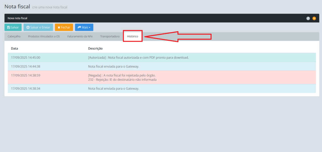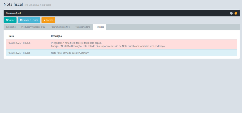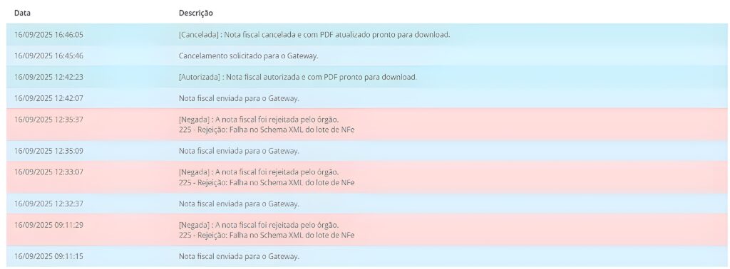 Na aba de histórico de cada nota fiscal, você encontra o status atual dela. Nas notas que falharam, uma mensagem de texto indica o motivo da não aprovação. É importante destacar que essa mensagem vem do órgão responsável pela autorização da nota, e não do Bike Conecta – por isso, essa informação está sempre “correta”, ao menos do ponto de vista da emissão.