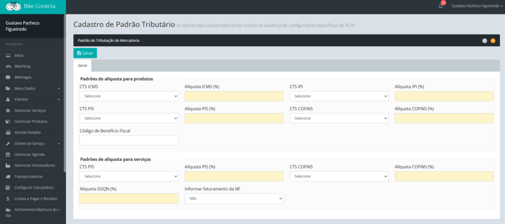 Os dados tributários da sua empresa devem ser preenchidos na função “Cadastros Tributários”, na aba “Padrões de tributos”. Essas informações são a base para toda a emissão das notas, assim como os dados presentes na aba “Movimentar em notas fiscais”, disponível em todos os produtos cadastrados no Bike Conecta.